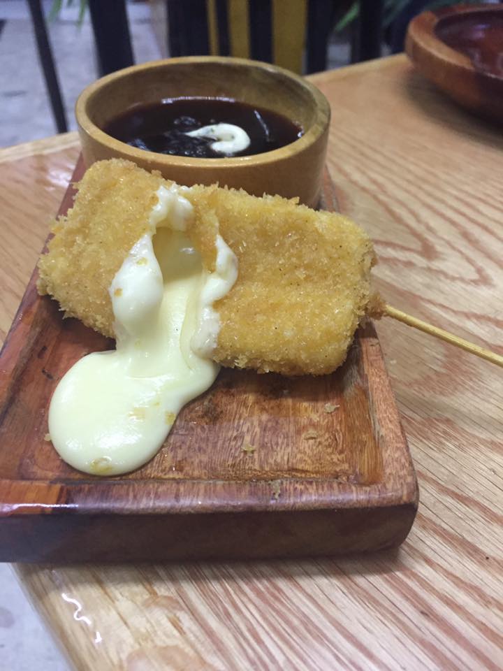 3 Kushiages de camarón, 3 Kushiages de plátano, 3 Kushiages de cangrejo con queso y 3 Kushiages de queso